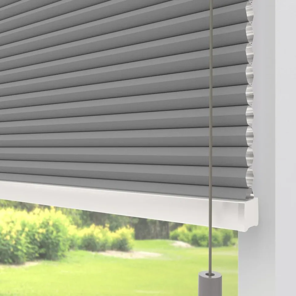 Verduisterende dubbele plissé grijs met witte achterzijde. De dubbel geplooide stof met een honingraatstructuur zorgt v…