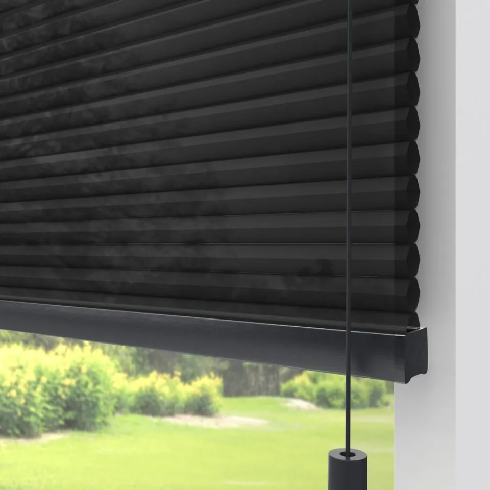 Lichtdoorlatende dubbele plissé zwart met lichte glans en meekleurende achterzijde. Dit mooie dubbele plissé gordijn heeft de hoogste isolatiewaarde. Het heeft een honingraatstructuur die een stilstaande luchtlaag creëert, dit zorgt voor een isolerende werking. Het zorgt ervoor dat de warmte binnen blijft als het buiten koud is en andersom. De aluminium coating aan de binnenzijde, levert de meeste energiebesparing op. Voor een isolerende werking kun je ook denken aan een combinatie tussen plisségordijnen en een overgordijn. De koorden zijn verwerkt in de honingraat en zijn niet zichtbaar. Verkrijgbaar als top down, top down bottom up of top down bottom up gespannen. Een top down bottom up gordijn kan zowel aan de bovenkant als de onderkant worden uitgevouwen voor volledige controle over de gewenste lichtinval en privacy. Een gespannen plissé is zeer geschikt voor draaikiepramen omdat de stof goed op zijn plek blijft. Op maat te maken en volledig naar wens samen te stellen. Bepaal zelf de kleur van het systeem en kies uit een bijpassende koordhanger van kunststof, rvs of zwart metaal.