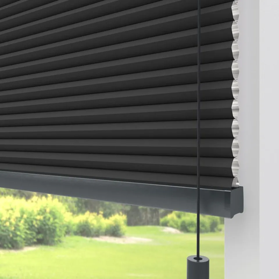 Verduisterende dubbele plissé zwart met meekleurende achterzijde. Dit mooie dubbele plissé gordijn heeft de hoogste isolatiewaarde. Het heeft een honingraatstructuur die een stilstaande luchtlaag creëert, dit zorgt voor een isolerende werking. Het zorgt ervoor dat de warmte binnen blijft als het buiten koud is en andersom. De aluminium coating aan de binnenzijde, levert de meeste energiebesparing op. Voor een isolerende werking kun je ook denken aan een combinatie tussen plisségordijnen en een overgordijn. De koorden zijn verwerkt in de honingraat en zijn niet zichtbaar. Verkrijgbaar als top down, top down bottom up of top down bottom up gespannen. Een top down bottom up gordijn kan zowel aan de bovenkant als de onderkant worden uitgevouwen voor volledige controle over de gewenste lichtinval en privacy. Een gespannen plissé is zeer geschikt voor draaikiepramen omdat de stof goed op zijn plek blijft. Op maat te maken en volledig naar wens samen te stellen. Bepaal zelf de kleur van het systeem en kies uit een bijpassende koordhanger van kunststof, rvs of zwart metaal.