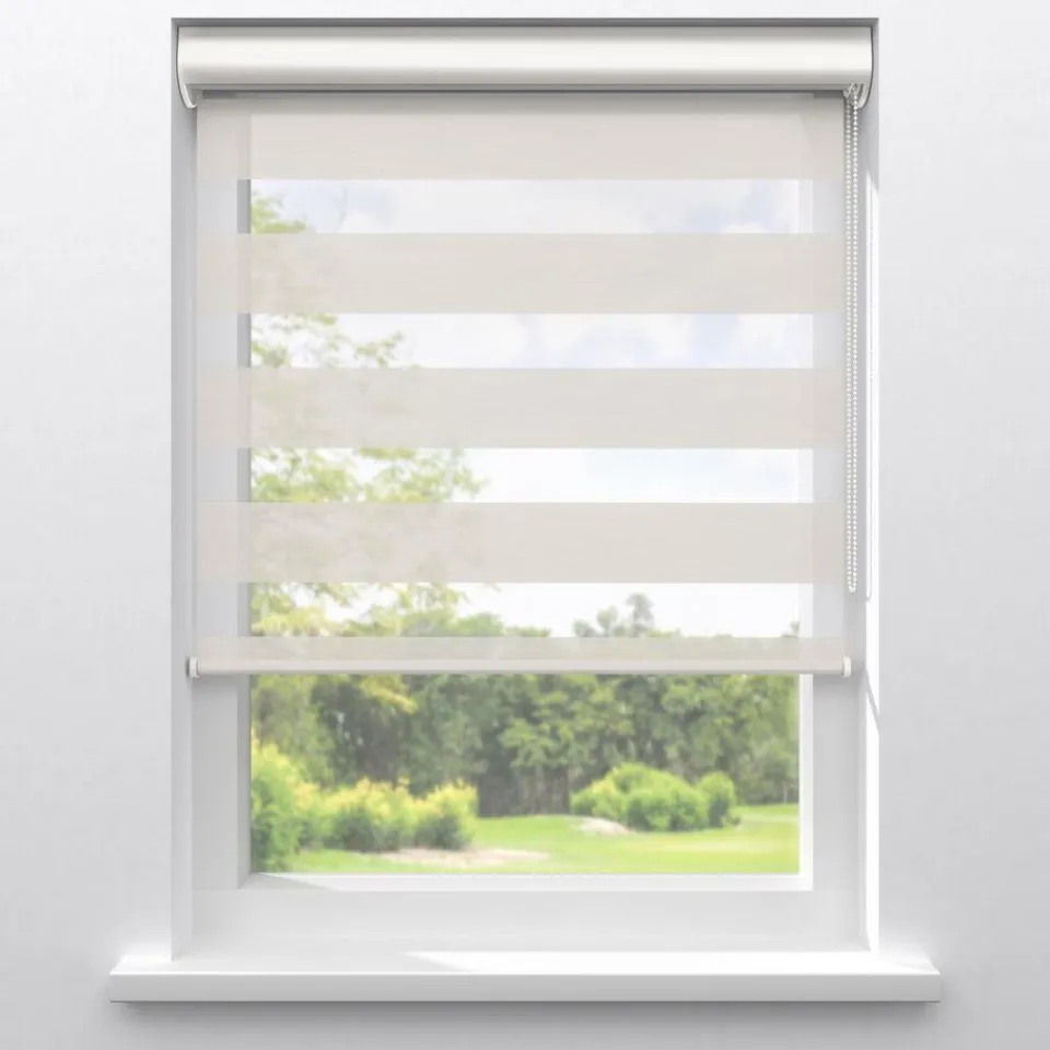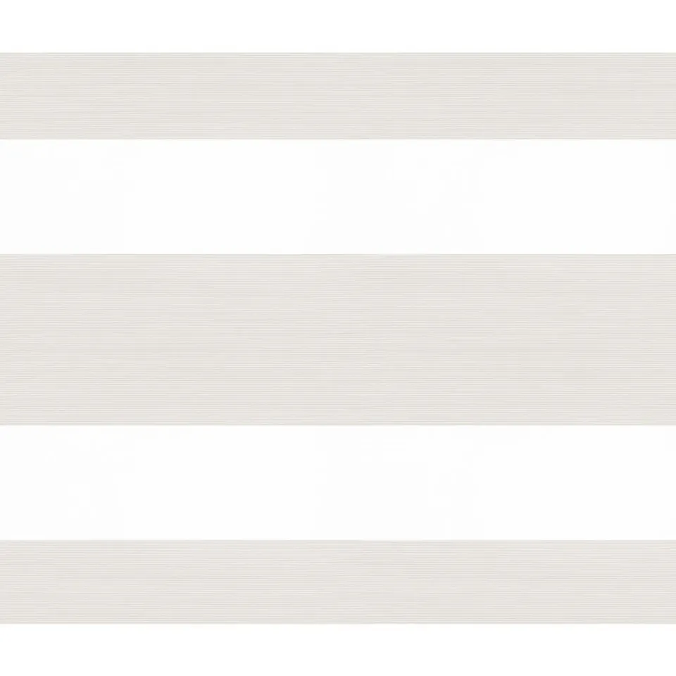 Lichtdoorlatend duo-rolgordijn off-white met streep dessin. De transparante banen hebben een grovere gaasstructuur. De a…