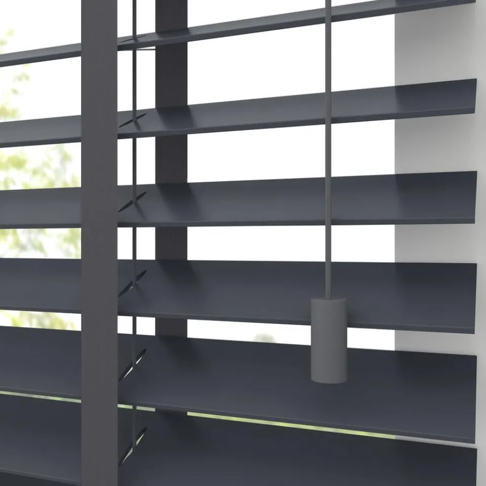 Houten jaloezie grijs met gelakte afwerking en lichte glans. 100% hout. De brede lamellen van 50 mm zorgen voor veel lichtinval en bieden veel privacy wanneer je deze sluit. Op maat te maken en volledig naar wens samen te stellen. Bepaal zelf de bedieningszijde en kies uit diverse accessoires en uitvoeringen. Keuze uit een bijpassend ladderkoord, 48 verschillende ladderbanden en een koordhanger van hout, rvs of zwart metaal.