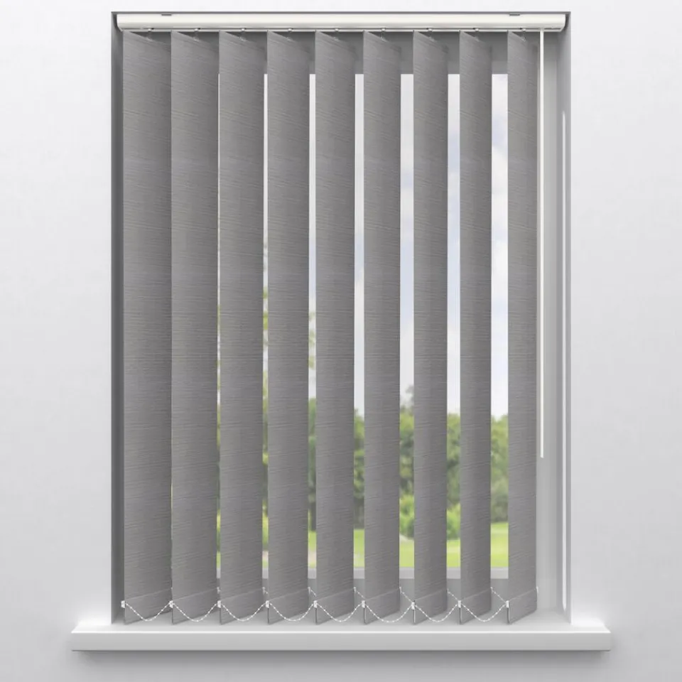 Verticale lamellen van een witte stof. De lamellen zijn 9 cm breed. Voor de rails kun je kiezen uit een witte of een gri…