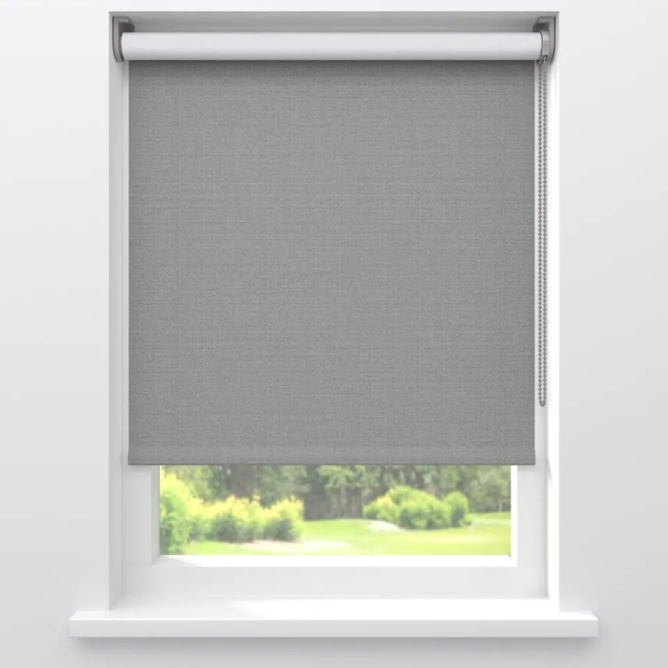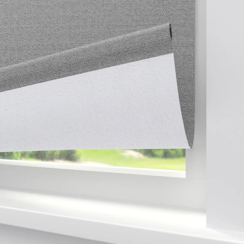 Verduisterend rolgordijn lichtgrijs met een grovere structuur. De witte achterzijde zorgt voor volledige verduistering. …