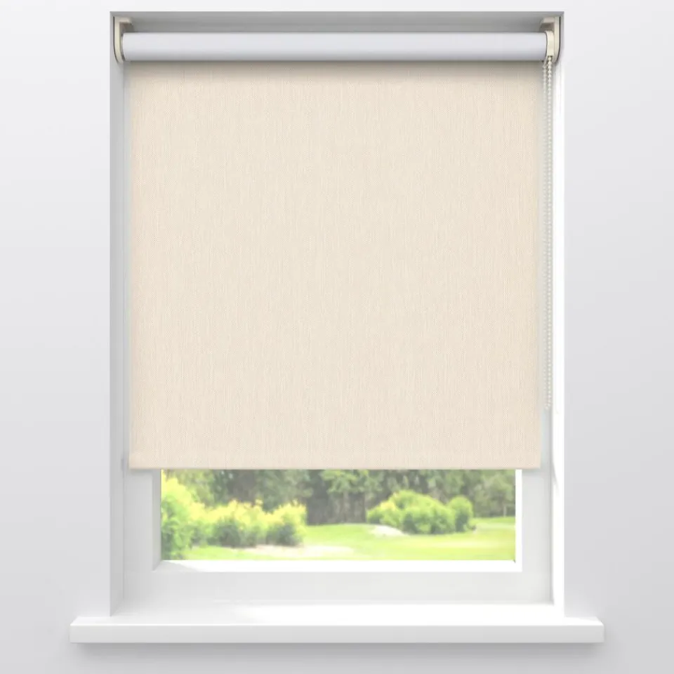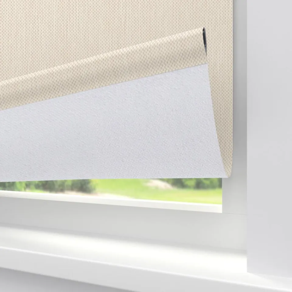 Verduisterend rolgordijn zandkleurig gemêleerd met verticale garens. De witte achterzijde zorgt voor volledige verduist…