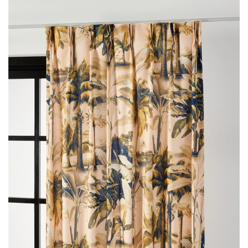 Lichtdoorlatende gordijnstof roze met botanische print. Soepelvallend, luchtig en stevig. Gemaakt van 100% katoen. 138 c…