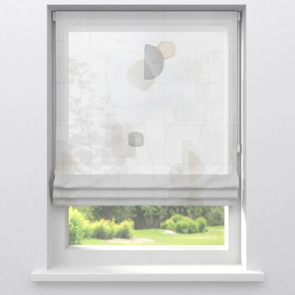 Transparante gordijnstof naturelkleurig met gedrukt abstract patroon. Stevig, vormvast en soepel. 300 cm.SpecificatiesKl…