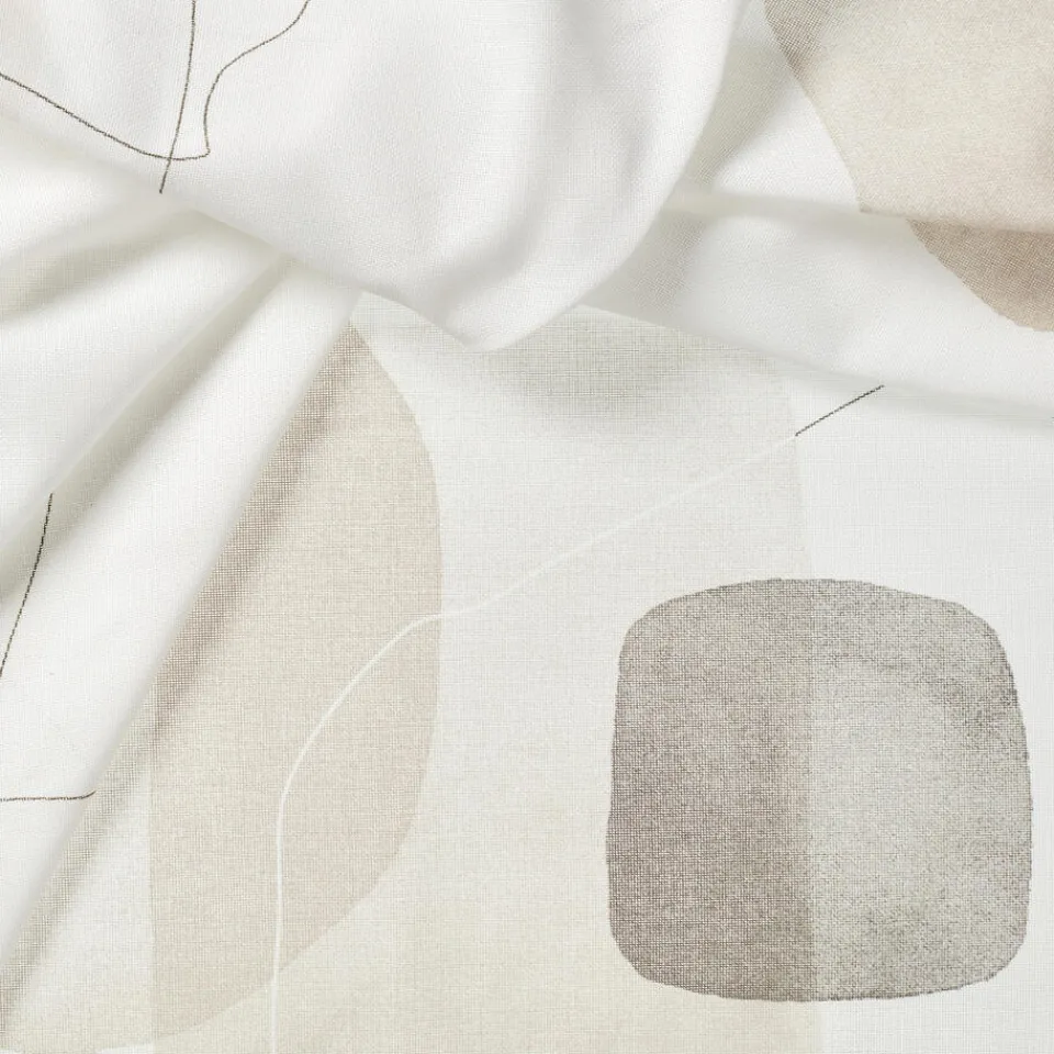 Transparante gordijnstof naturelkleurig met gedrukt abstract patroon. Stevig, vormvast en soepel. 300 cm.