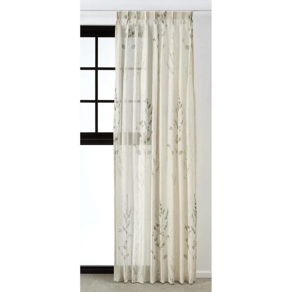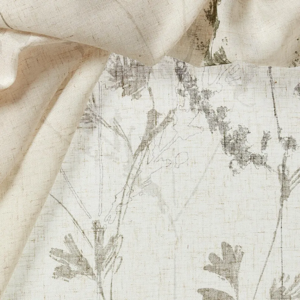 Transparante gordijnstof met botanische print, natuurlijke uitstraling en linnenlook (15% linnen). Soepelvallend. 300 cm.