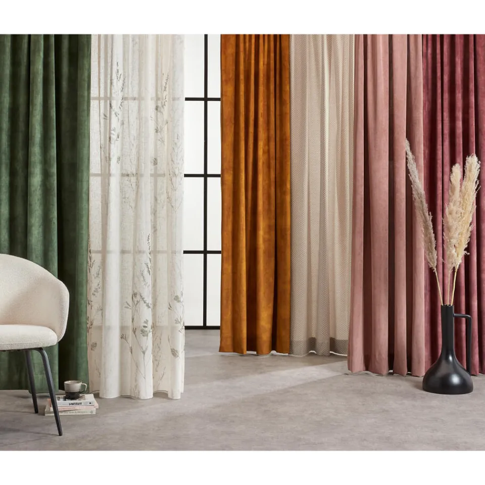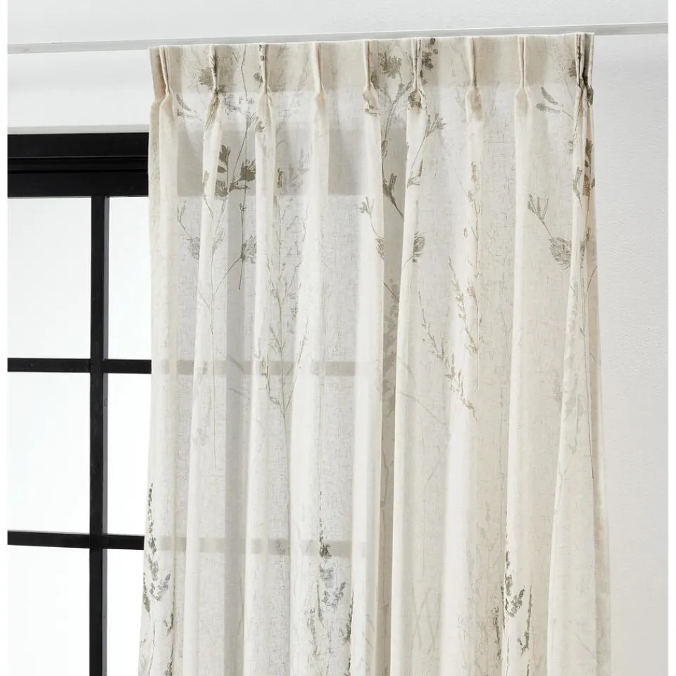 Transparante gordijnstof met botanische print, natuurlijke uitstraling en linnenlook (15% linnen). Soepelvallend. 300 cm…