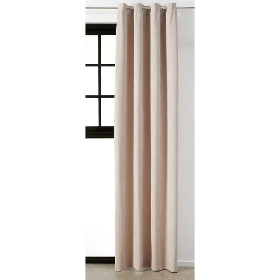 Kant en klaar ringgordijn van stevige beige stof. Soepelvallend en kreukherstellend. 135 cm breed.
