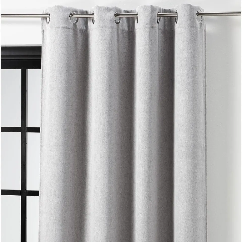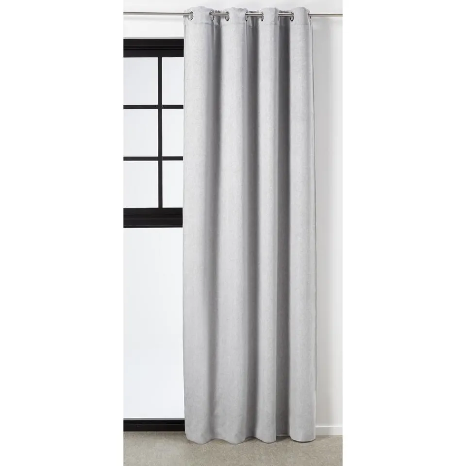 Verduisterend kant en klaar ringgordijn van stevige grijze stof. Soepelvallend en kreukherstellend. 135 cm breed.