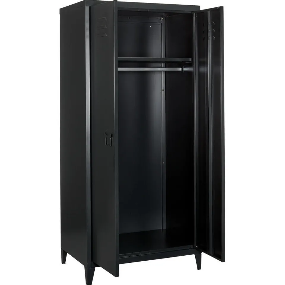Stoere kledingkast van zwart metaal. Ziet er uit als een lockerkast. Met 2 deuren, een hanggedeelte en 1 legplank. 76×50…
