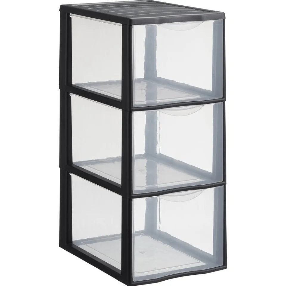 Ladekast zwart met 3 transparante lades. De lades hebben brede handgrepen en door het transparante materiaal zie je in één oogopslag wat je zoekt. Licht in gewicht, makkelijk te reinigen en duurzaam. Gemaakt van gerecycled kunststof (50%). 36x26x58 cm (lxbxh).
