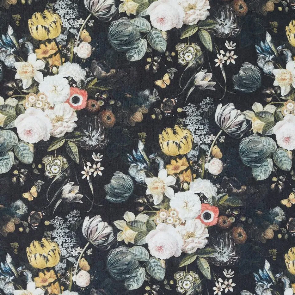 Gordijnstof zwart met dessin van bloemen. 100% katoen. Stevig en ademend. 140 cm breed.