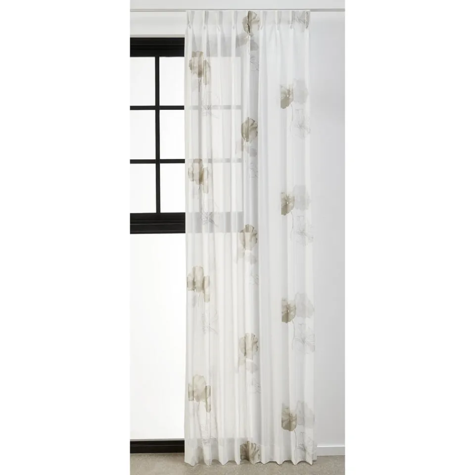 Vitrage Aukje in een witte kleur. Deze stof heeft een hele subtiele print van grijze bloemen. Gemaakt van 100% polyester…
