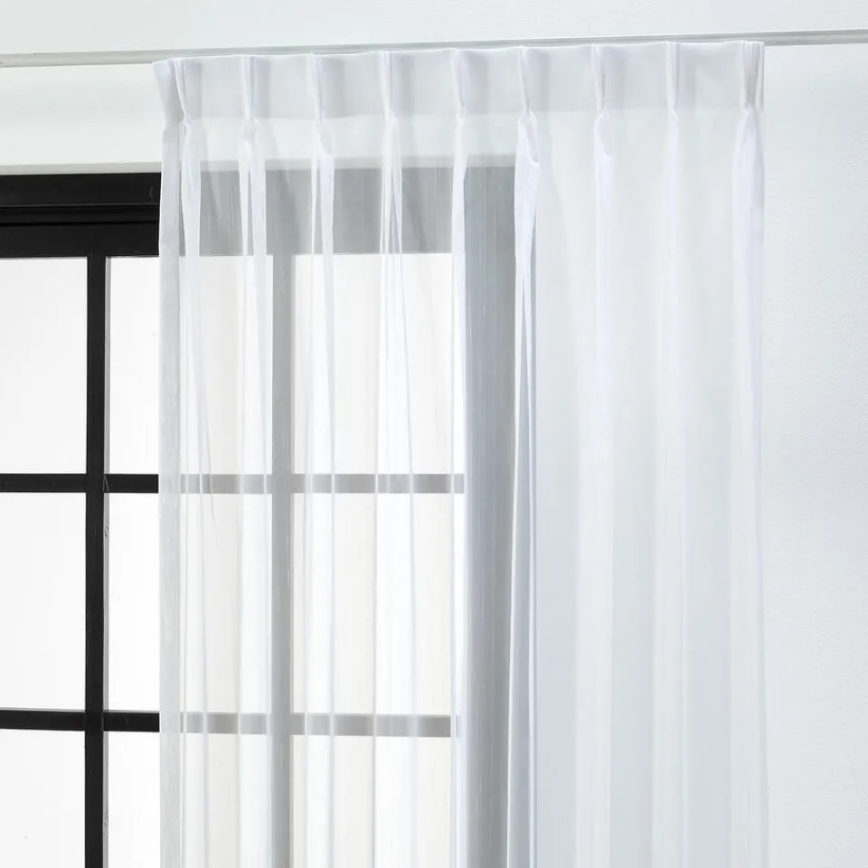 Vitrage Vera in een witte kleur. Deze stof is gemaakt van 95% gerecycled polyester en 5% polyester. De stof heeft een heel licht gestreept patroon. Stofhoogte is 300 centimeter.