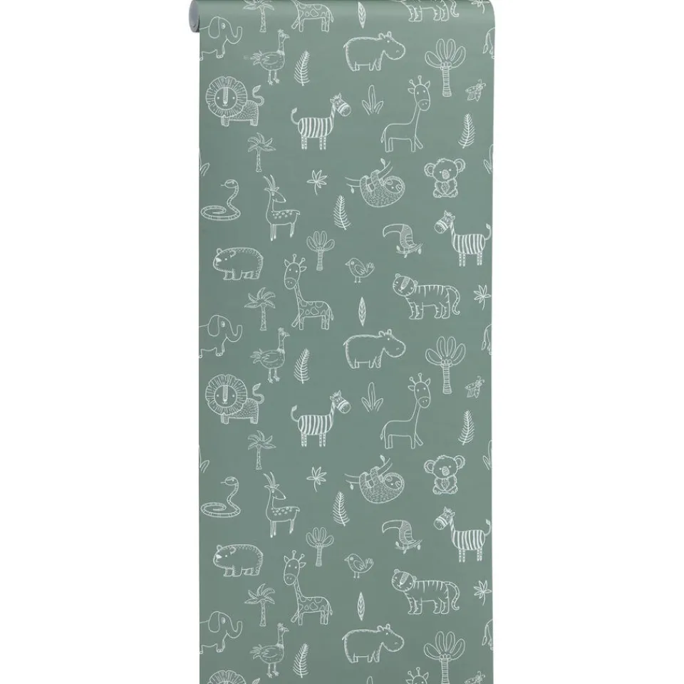 100% vliesbehang DuurzaamPerfect voor de kinderkamer Vliesbehang Veerle in sfeervolle groene kleur met een prachtig die…