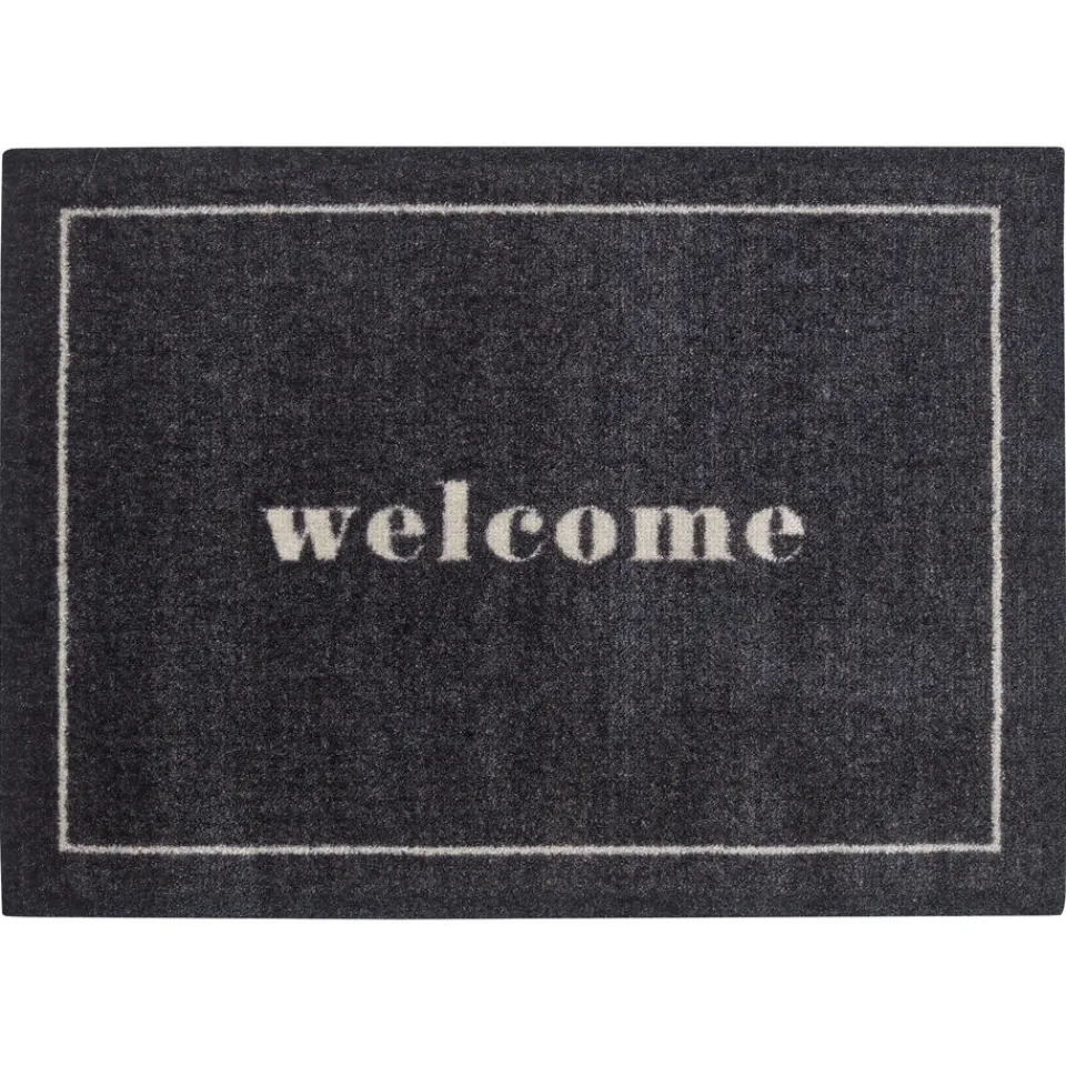 Deurmat Rockton in de kleur antraciet met beige welkomstekst. Anti-slip. Gemaakt van 100% polyamide met een rubberen rug. Geschikt voor buiten en binnen. 70×50 cm (lxb).