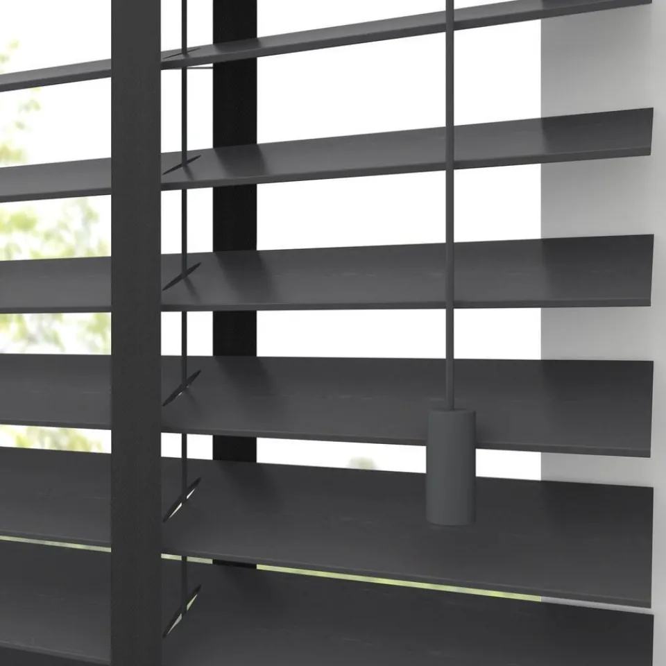 Houten jaloezie zwart met karakteristieke bamboe structuur en landelijke uitstraling. 100% bamboe. De brede lamellen van 50 mm zorgen voor veel lichtinval en bieden veel privacy wanneer je deze sluit. Op maat te maken en volledig naar wens samen te stellen. Bepaal zelf de bedieningszijde en kies uit diverse accessoires en uitvoeringen. Keuze uit een bijpassend ladderkoord, 48 verschillende ladderbanden en een koordhanger van hout, rvs of zwart metaal.
