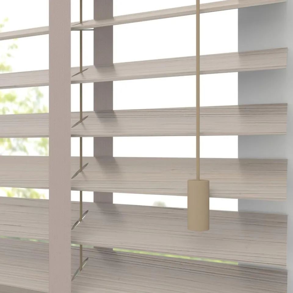 Houten jaloezie zandkleurig. 100% bamboe. De brede lamellen van 50 mm zorgen voor veel lichtinval en bieden veel privacy wanneer je deze sluit. Op maat te maken en volledig naar wens samen te stellen. Bepaal zelf de bedieningszijde en kies uit diverse accessoires en uitvoeringen. Keuze uit een bijpassend ladderkoord, 48 verschillende ladderbanden en een koordhanger van hout, rvs of zwart metaal.