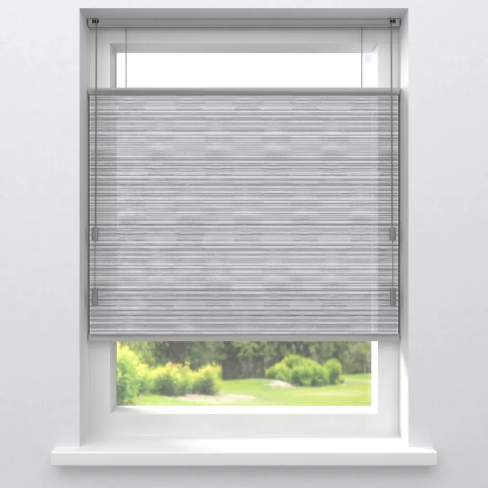 Lichtdoorlatende dubbele plissé lichtgrijs met streeppatroon met witte achterzijde. Dit mooie dubbele plissé gordijn h…
