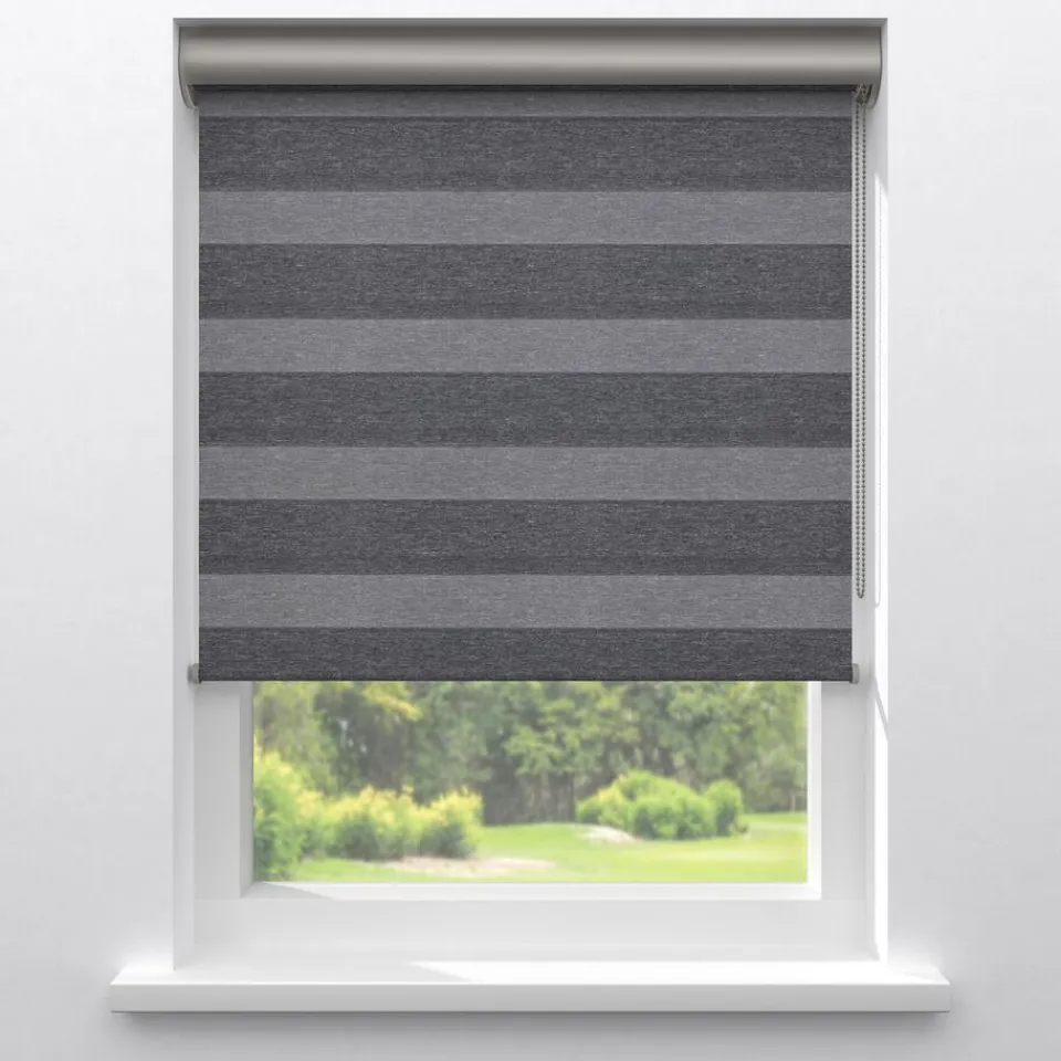 Lichtdoorlatend duo-rolgordijn donkergrijs gemêleerd. De transparante banen hebben een fijne gaasstructuur. De afwisselende open en dichte stofbanen bewegen voor elkaar langs. Zo bepaal je eenvoudig de lichtinval en privacy. Je kunt zelf de kleur kiezen van de cassettes, eindkappen, kettingen, onderlatten en roedes. De bedieningszijde kies je ook zelf: rechts of links. Op maat te maken en eenvoudig met de juiste afmetingen te bestellen.