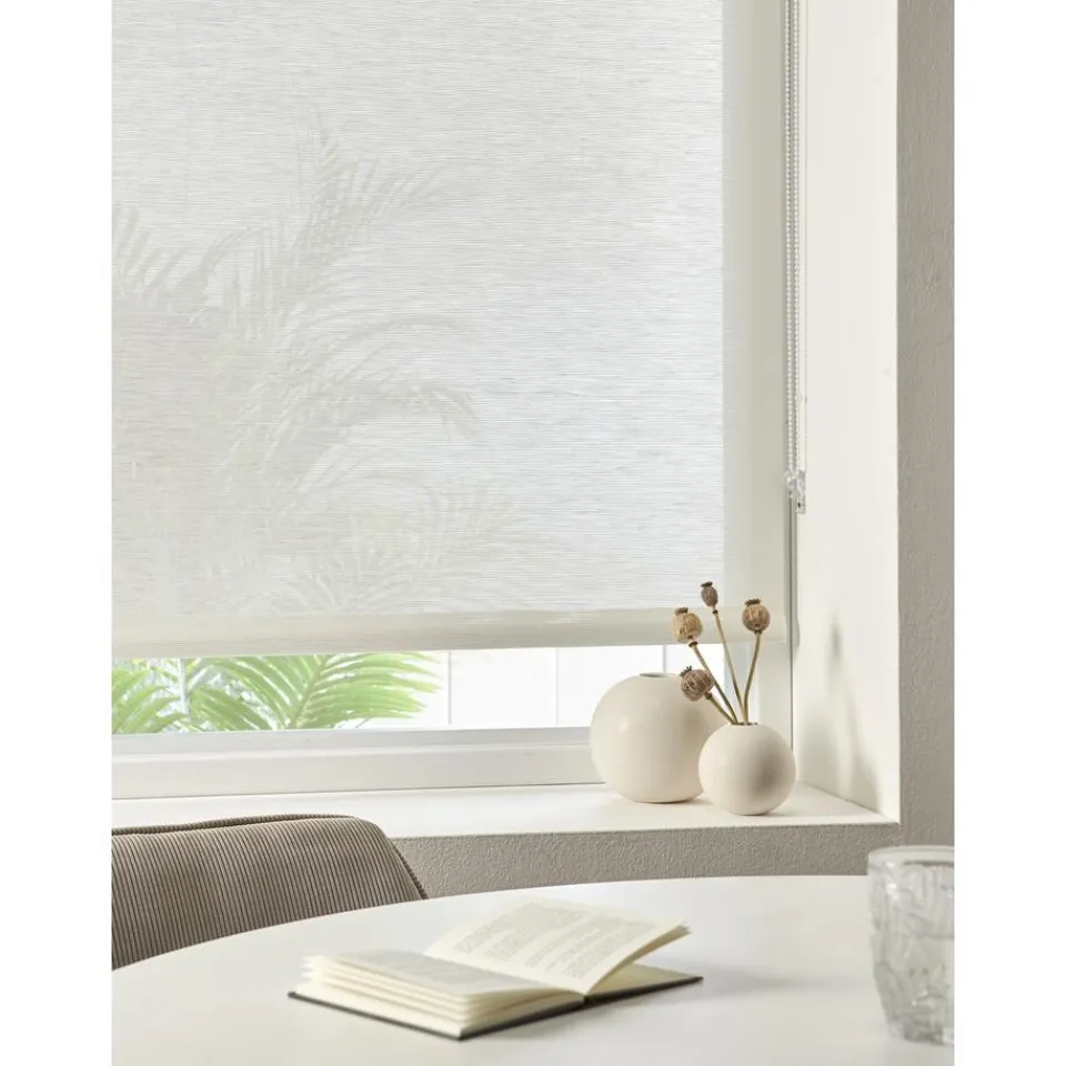 Transparant rolgordijn wit met grove weefstructuur. De stof laat veel licht door en filtert lichtinval op een natuurlijk…
