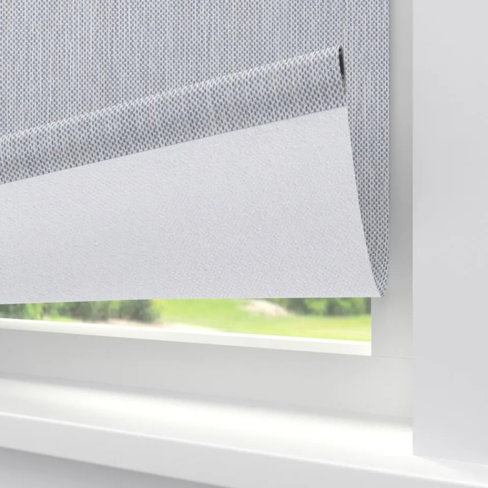 Verduisterend rolgordijn lichtgrijs gemêleerd met verticale garens. De witte achterzijde zorgt voor volledige verduiste…