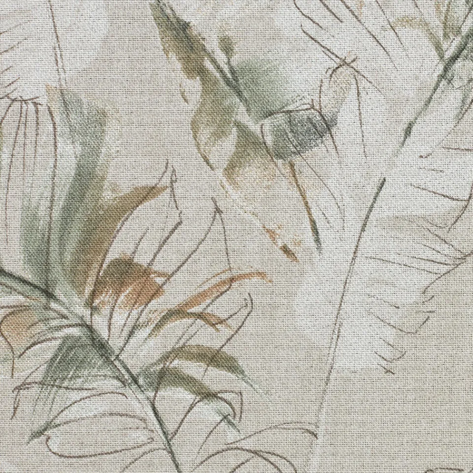 Verduisterende gordijnstof Barbara in de kleur groen met een patroon van bladeren. Stevig, vormvast en slijtvast. Dit bl…