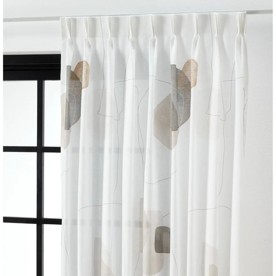 Transparante gordijnstof naturelkleurig met gedrukt abstract patroon. Stevig, vormvast en soepel. 300 cm.SpecificatiesKl…