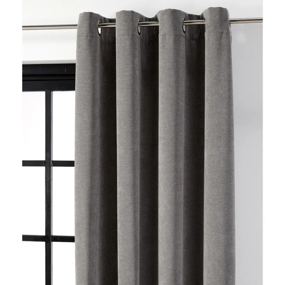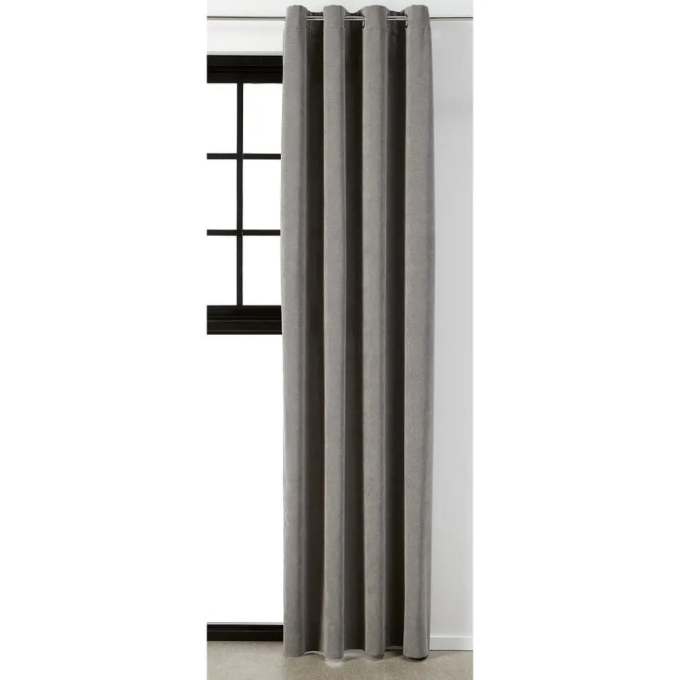 Kant en klaar ringgordijn van stevige grijze stof. Soepelvallend en kreukherstellend. 135 cm breed.