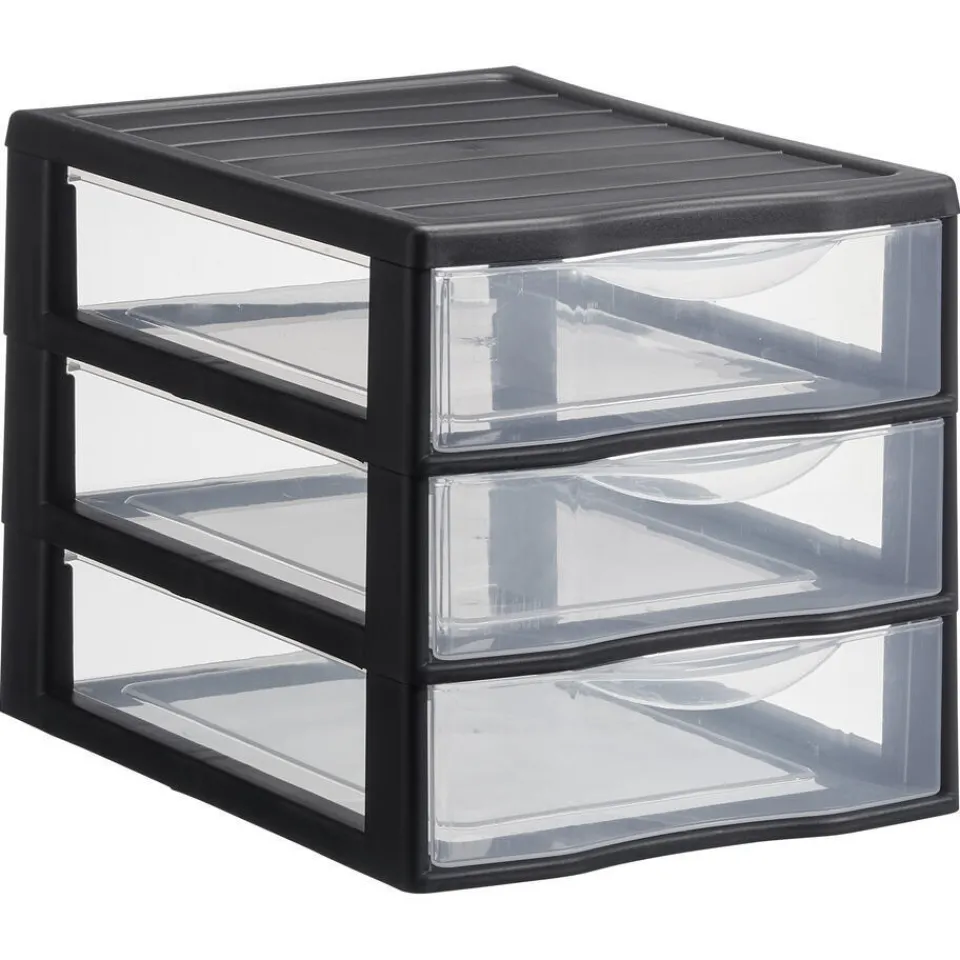 Ladekast met 3 transparante lades. De lades hebben brede handgrepen en door het transparante materiaal zie je in één oogopslag wat je zoekt. Licht in gewicht, makkelijk te reinigen en duurzaam. Gemaakt van gerecycled kunststof (50%).36x26x25 cm (lxbxh).