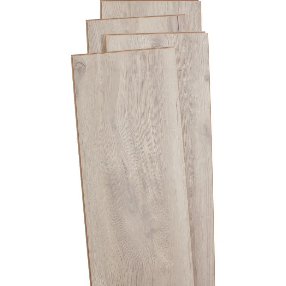 Laminaat wit eiken met 4-zijdige V-groef. Geschikt voor intensief woongebruik. Voorzien van het FSC-keurmerk. 8 mm dik.