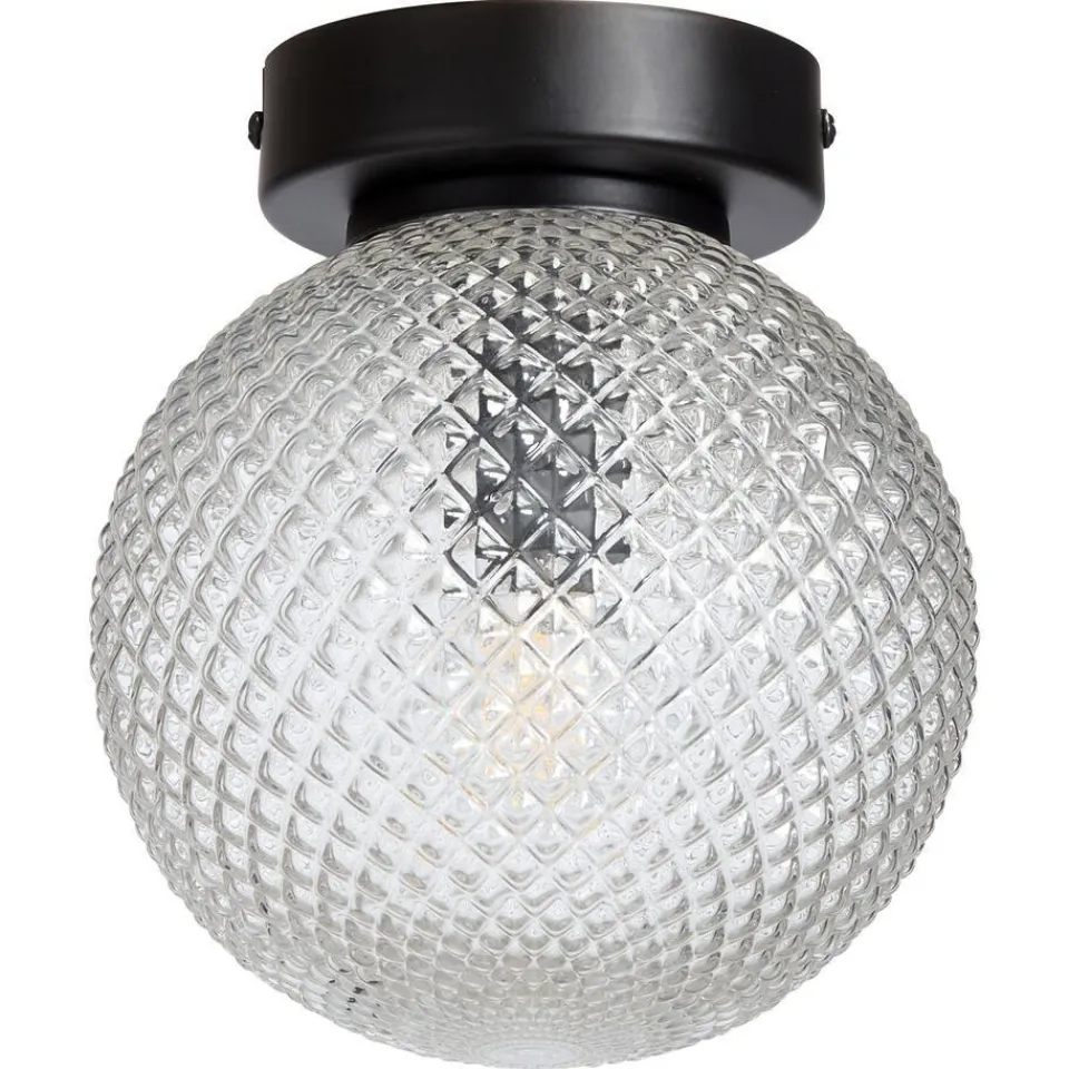 Ronde plafondlamp van wit glas met structuur en zwart metalen afwerking. Kleine fitting E14. 15 cm doorsnede.Specificati…