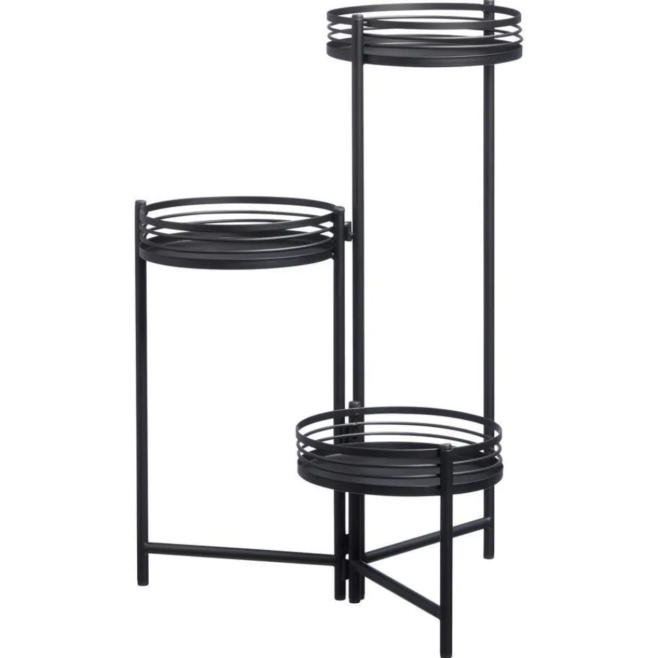 Het Catania plantenrek is een prachtige toevoeging aan je interieur met zijnzwarte kleur en elegante ronde vormen. Met ruimte voor drie planten en/of bloempotten biedtdit rek een charmante en sfeervolle manier om groen in huis te brengen.Perfect voor binnen, maar extra leuk onder je veranda of overkapping.Met afmetingen van 42×60 cm (diameter x hoogte) past dit metalen rek in elke ruimte.