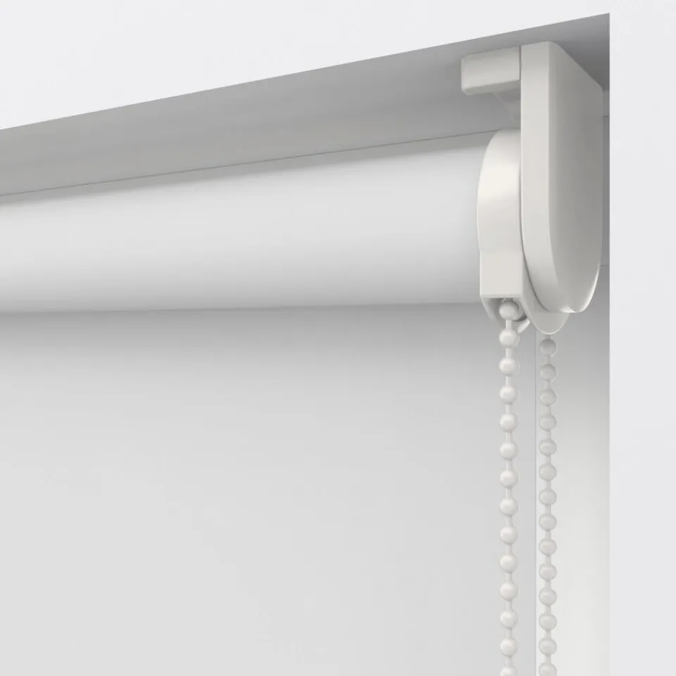 Verduisterend rolgordijn effen wit met meekleurende achterzijde. Dit rolgordijn is op maat te maken en is samengesteld met witte eindkappen, witte kunststof ketting, aluminium ovale onderlat en universele wand- en plafondsteun. Eenvoudig af te nemen met een vochtige doek.