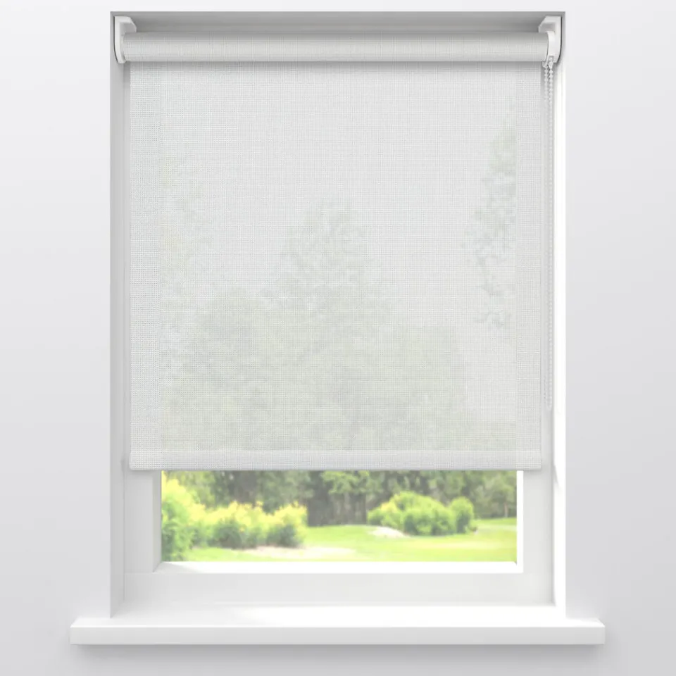 Screen rolgordijn Seb is wit van kleur en lichtdoorlatend. Het materiaal bestaat uit glasvezeldraden met een PVC-coating. Hierdoor is de stof niet alleen sterk, maar filtert ook het zonlicht en blokkeert het inkijk. Dit systeem is alleen geschikt voor binnen gebruik en valt niet te monteren voor buiten het raam.