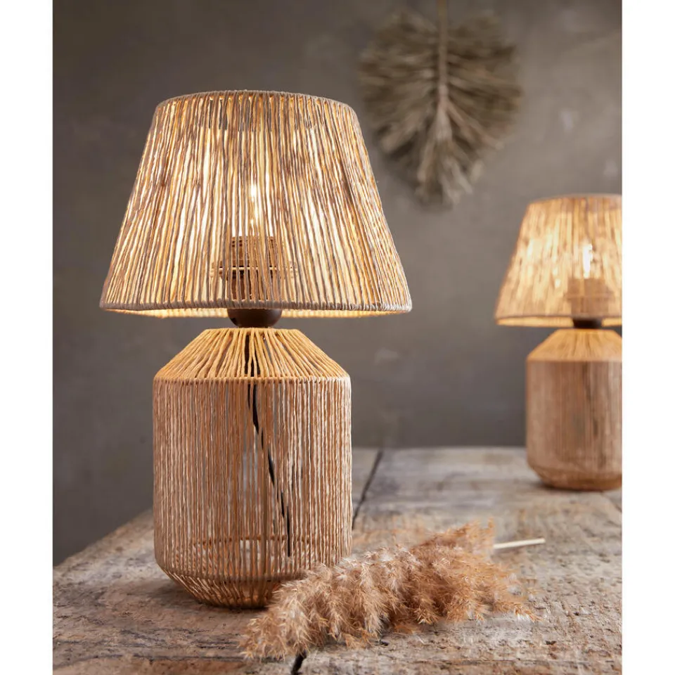Tafellamp Avi gemaakt van 80% touw en 20% metaal. De lamp heeft een snoerlengte van 150 centimeter. ø20×32 centimeter.