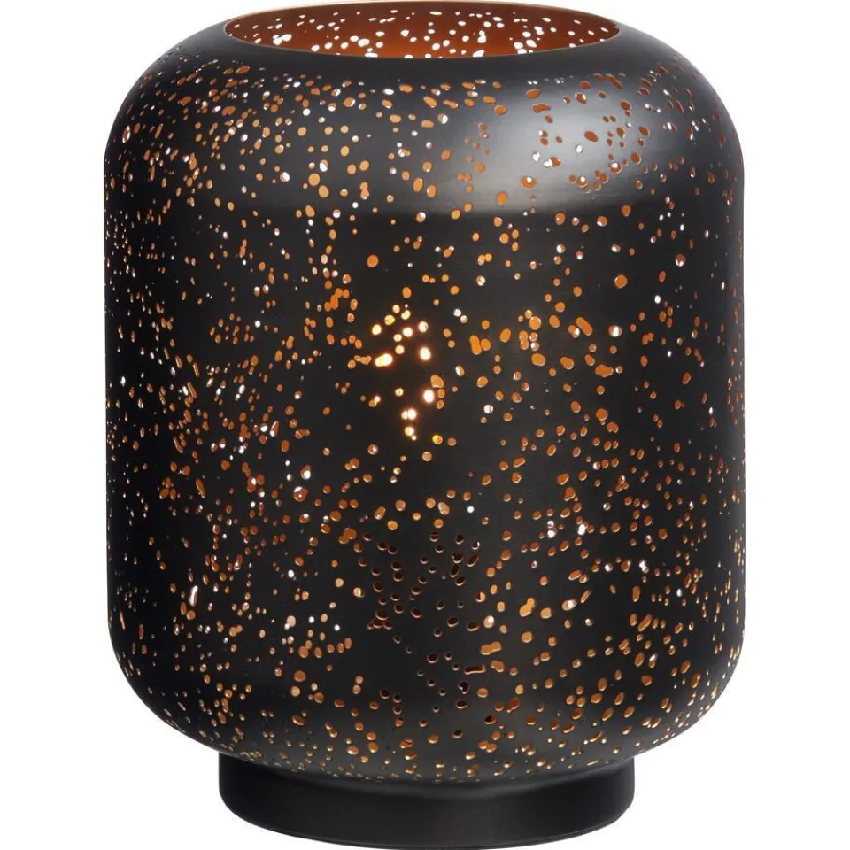 Tafellamp van opengewerkt zwart metaal en goudkleurige binnenzijde. Grote fitting E27. 25 cm hoog.